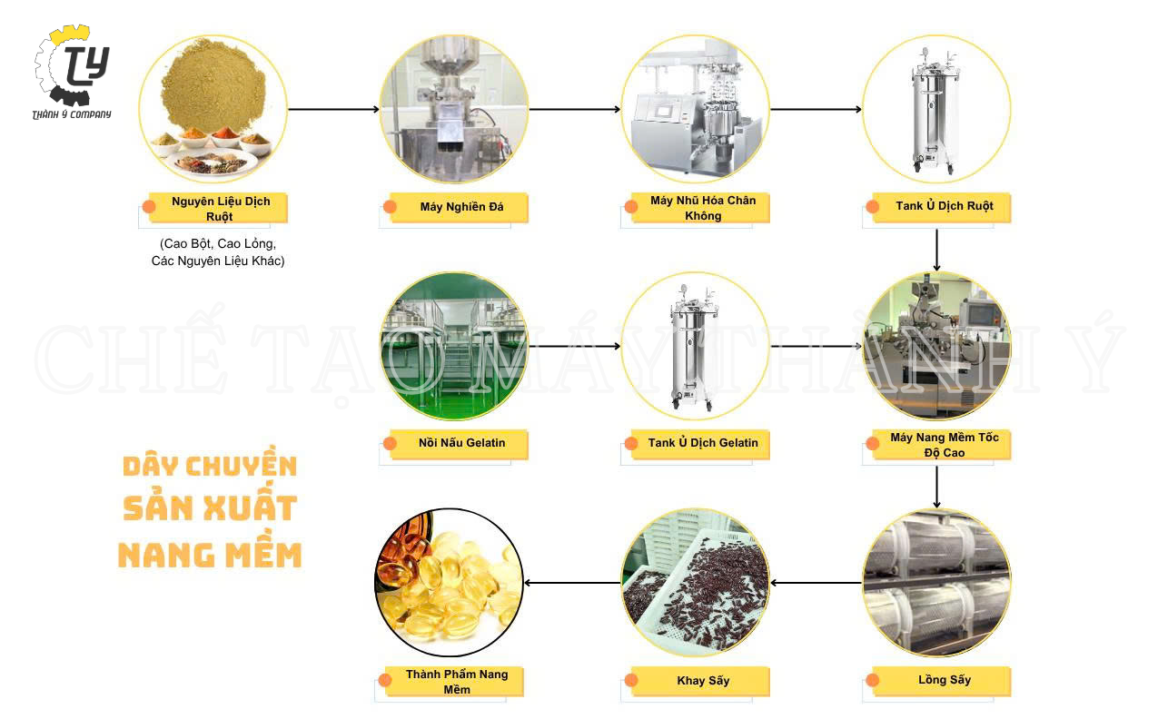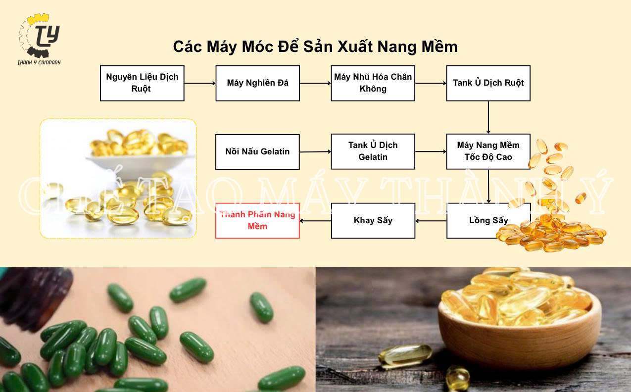 Về cơ bản, quy trình sản xuất nang mềm diễn ra liên tục từ khâu chuẩn bị nguyên liệu (nghiền, trộn, nhũ hóa và nấu gelatin), sau đó gelatin được cán thành hai dải mỏng và đưa vào khuôn quay để bơm nguyên liệu, tạo hình và hàn kín viên nang. Tiếp theo, nang được sấy quay và sấy tĩnh để đạt độ ẩm tiêu chuẩn, trước khi kiểm tra chất lượng và đóng gói thành phẩm.