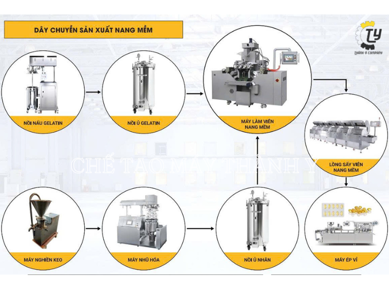 Dây chuyền sản xuất nang mềm bao gồm nhiều thiết bị liên kết chặt chẽ với nhau, mỗi thiết bị đảm nhiệm một chức năng riêng biệt:
