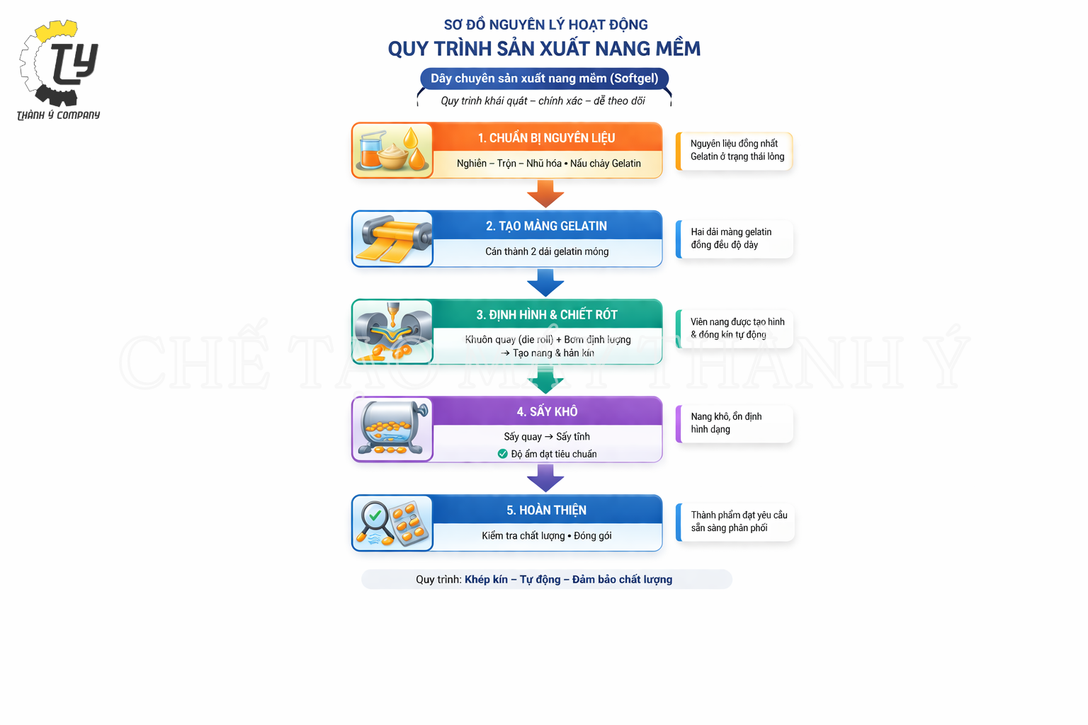 Nắm bắt xu hướng đó, Thành Ý cung cấp dây chuyền sản xuất nang mềm đồng bộ, tích hợp công nghệ hiện đại, giúp kiểm soát toàn diện từ khâu xử lý nguyên liệu, tạo màng gelatin đến đóng nang và sấy khô. Hệ thống được thiết kế nhằm đảm bảo độ chính xác cao, vận hành bền bỉ và phù hợp với nhiều loại nguyên liệu khác nhau. Nhờ đó, doanh nghiệp không chỉ cải thiện chất lượng sản phẩm mà còn tối ưu chi phí vận hành, tăng năng suất và đáp ứng tốt các tiêu chuẩn nghiêm ngặt trong sản xuất công nghiệp.