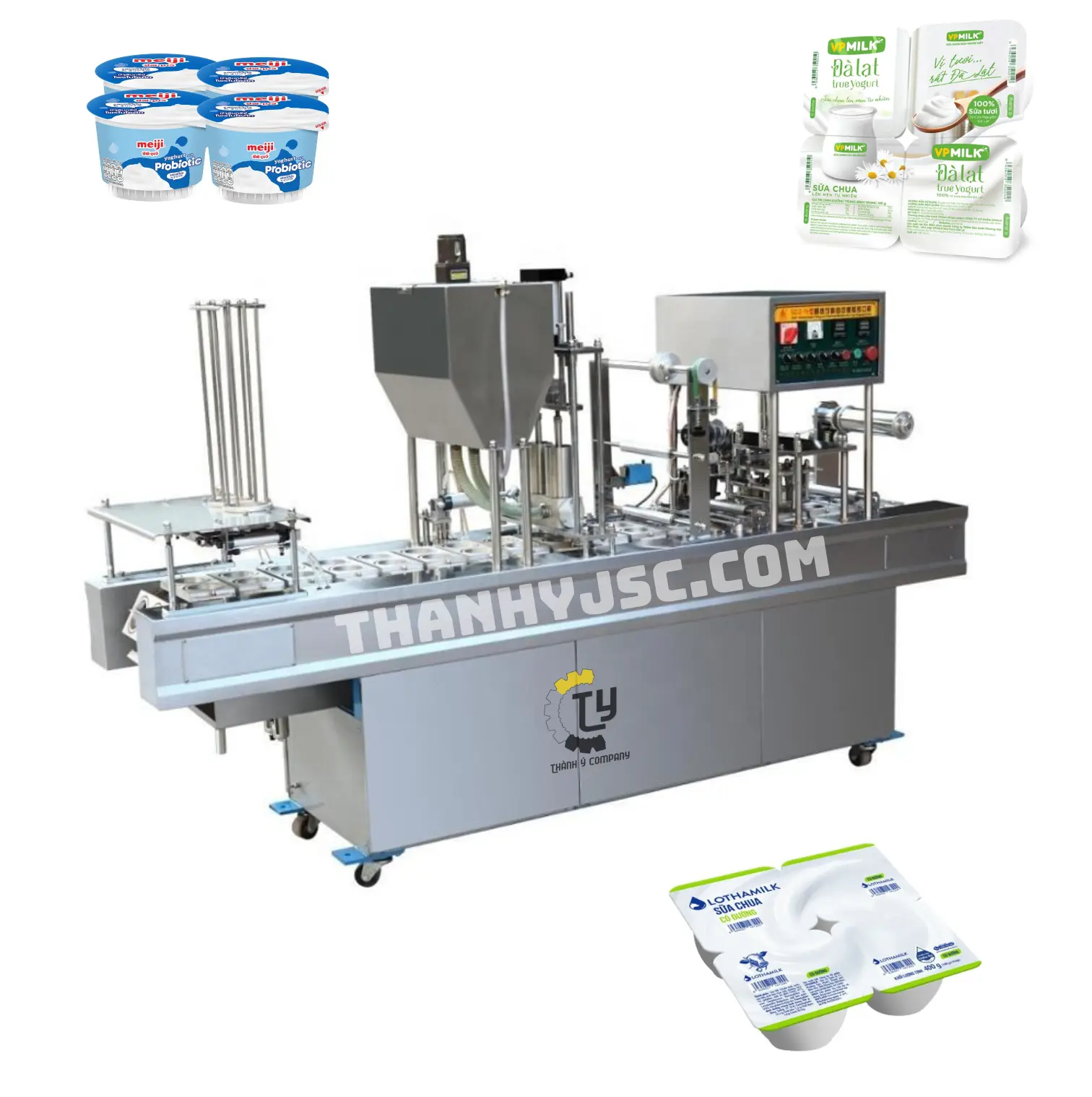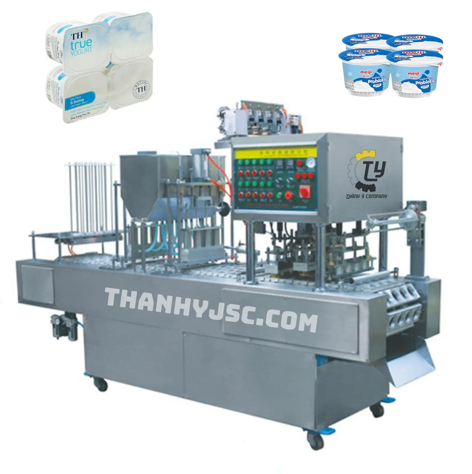 Máy ép vỉ sữa chua là thiết bị chuyên dụng dùng trong ngành thực phẩm để sản xuất các loại sữa chua, sữa tươi, thạch hoặc thực phẩm lỏng đóng cốc. Dòng máy YSDXR12000 là dây chuyền tự động hoàn toàn, thực hiện đồng bộ các công đoạn: định hình cốc nhựa từ tấm PS, chiết rót nguyên liệu, hàn màng nắp, cắt thành vỉ và loại bỏ phế liệu.