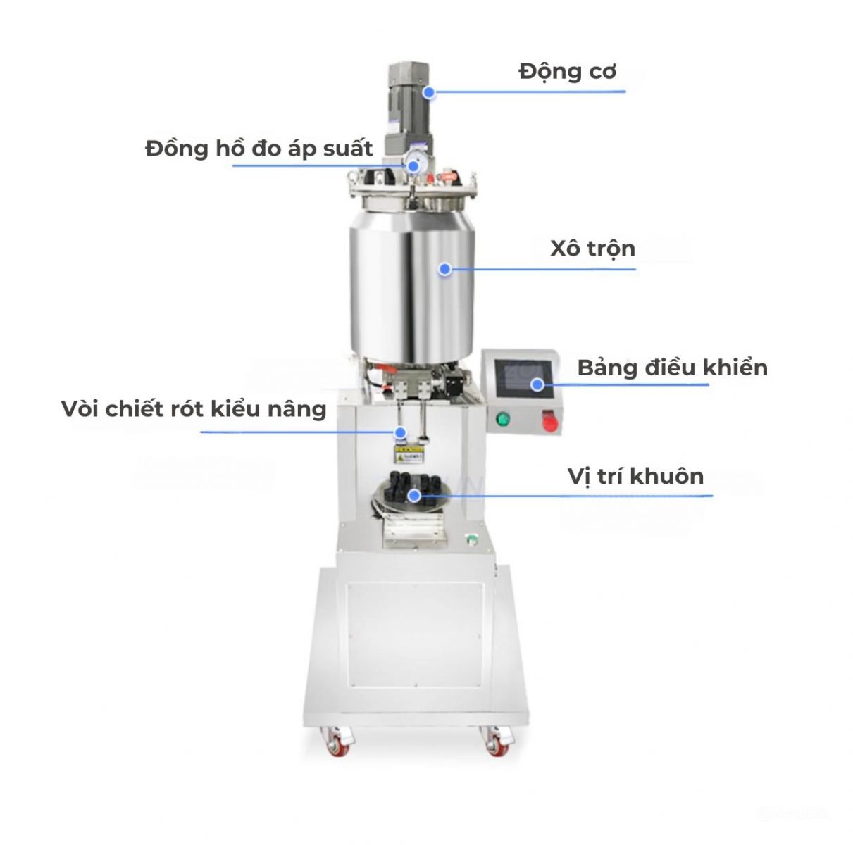 - Hệ thống gia nhiệt và trộn: Đảm bảo nguyên liệu được gia nhiệt và trộn đều trước khi chiết rót.